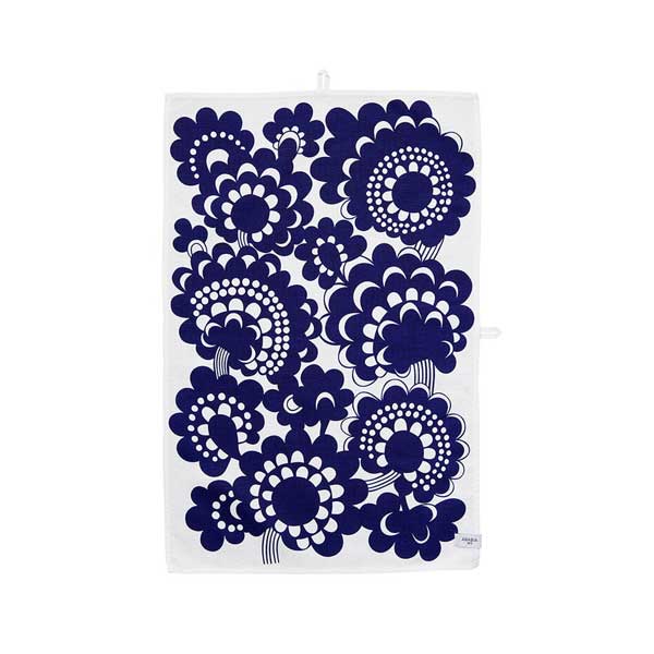 Arabia Esteri keittiöpyyhe tuo kauniin sinisen kukkakuvion keittiön sisustukseen. Täydentää upeasti muita Arabian Esteri-kuosein koristeltuja sisustustuotteita.