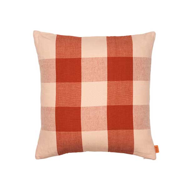 Ferm Living Grand tyynyn ruutukuviointi ja roosa väri tuovat kivaa lämpöä sekä rytmiä sisustukseen.