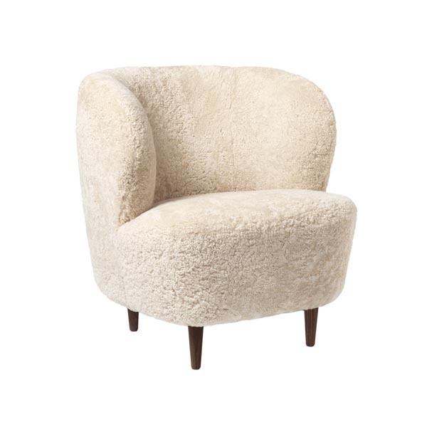 Gubi Stay nojatuoli on muhkea, lampaantaljalla päällystetty sisustuselementti, jossa kelpaa istuskella lukemassa kirjaa.