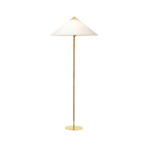 Gubi Tynell 9602 lattiavalaisin on upea yhdistelmä messinkiä, rottinkia ja kangasta. Varjostinosa on kuin kiinalainen hattu rottinkipunoksisen ohuen jalan päällä.
