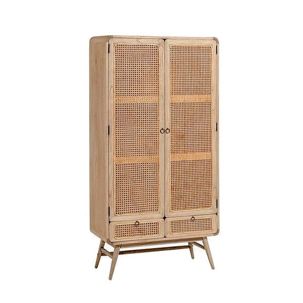 Kave Home Nalu kaappi on kaunis yhdistelmä puuta ja rottinkia. Tämä hieman retrohenkinen kaappi tuo tilaan myös ripauksen eksotiikkaa.