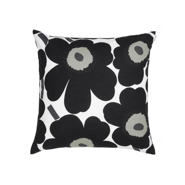 Marimekko Pieni Unikko tyynynpäällinen tuo klassisen kuosin mukaan sisustukseen. Mustavalkoinen väri antaa kuosille sopivan hillityn ilmeen.