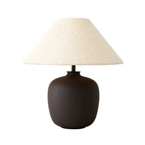 Menu Torso pöytävalaisimen keraaminen musta jalusta saa kontrastia valkoisesta tekstiilivarjostimesta.