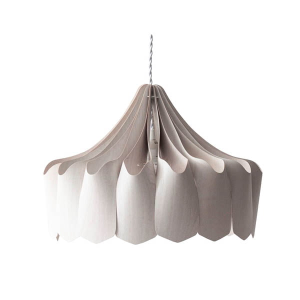 Showroom Finland Pioni riippuvalaisin on kuin kaunis katosta laskeutuva kukkanen. Ohuesta koivuvanerista valmistettu varjostin saa valon hehkumaan pehmeästi ympäröivään tilaan.