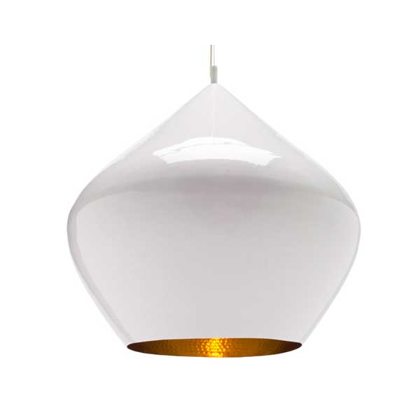 Tom Dixon Beat Stout riippuvalaisin on hurmaavan muhkea, melkein kuin ylösalaisin oleva iso astia. Sisäpinnan messinkinen taontakuvio antaa upean kontrastin valkoiselle ulkopinnalle.