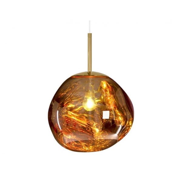 Tom Dixon Melt Mini riippuvalaisin on kuin muotoonsa sulanut pallo, jonka sisällä oleva valaisin saa kullan värin hehkumaan näyttävänä lämpimänä.