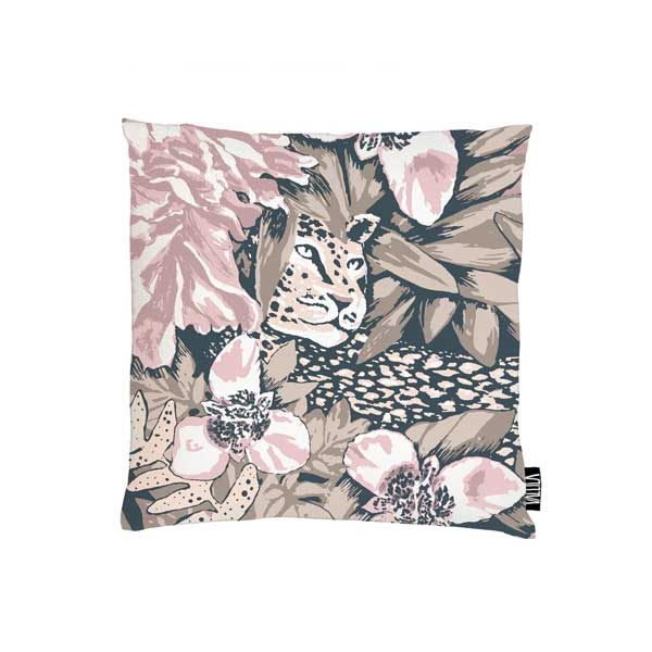 Vallila Kissanpäivä tyynynpäällisessä on hempeä sekoitus beigeä ja vaaleanpunaista. Kaunis lisä olohuoneen sohvalle.