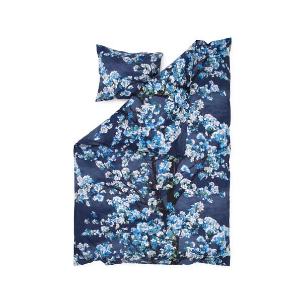 Vallila Omenapuu pussilakanasetissä kukkii kesäiset omenapuut, jotka nousevat upeasti esiin pussilakanan sinisenä hehkuvan värimaailman keskeltä.