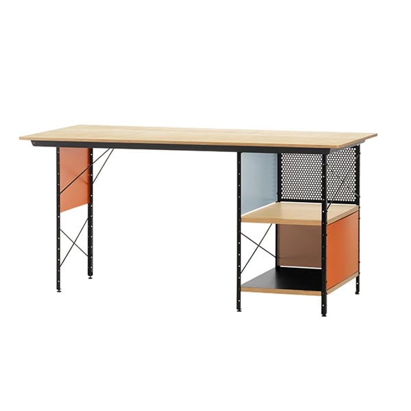 Vitra Eames Desk Unit työpöytä on tyylikäs yhdistelmä teollista ja modernia muotokieltä, jossa pöytä- ja hyllytasojen väripaletti tuo kivaa leikkisyyttä pöydän yleisilmeeseen.